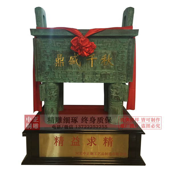 傳說夏禹曾收九牧之金,鑄九鼎于荊山之下,以象征九州,并在上面鐫刻魑魅魍魎的圖形,讓人們警惕,防止被其傷害。自從有了禹鑄九鼎的傳說,鼎就從一般的炊器而發(fā)展為傳國重器。國滅則鼎遷,夏朝滅,商朝興,九鼎遷于商都亳(bó)京;商朝滅,周朝興,九鼎又遷于周都鎬(hào)京。此后,就把定都或建立王朝稱為“定鼎”。中正銅雕-銅鼎廠家位置,唐縣銅鼎廠家位置,大型銅鼎廠家位置,追求卓越、開拓創(chuàng)新、“重合同”、“守信譽(yù)”、讓客戶滿意的經(jīng)營理念。唐縣中正銅雕工藝品廠竭誠為國內(nèi)外客戶提供優(yōu)秀的服務(wù),愿與新老客戶攜手共創(chuàng)美好未來。